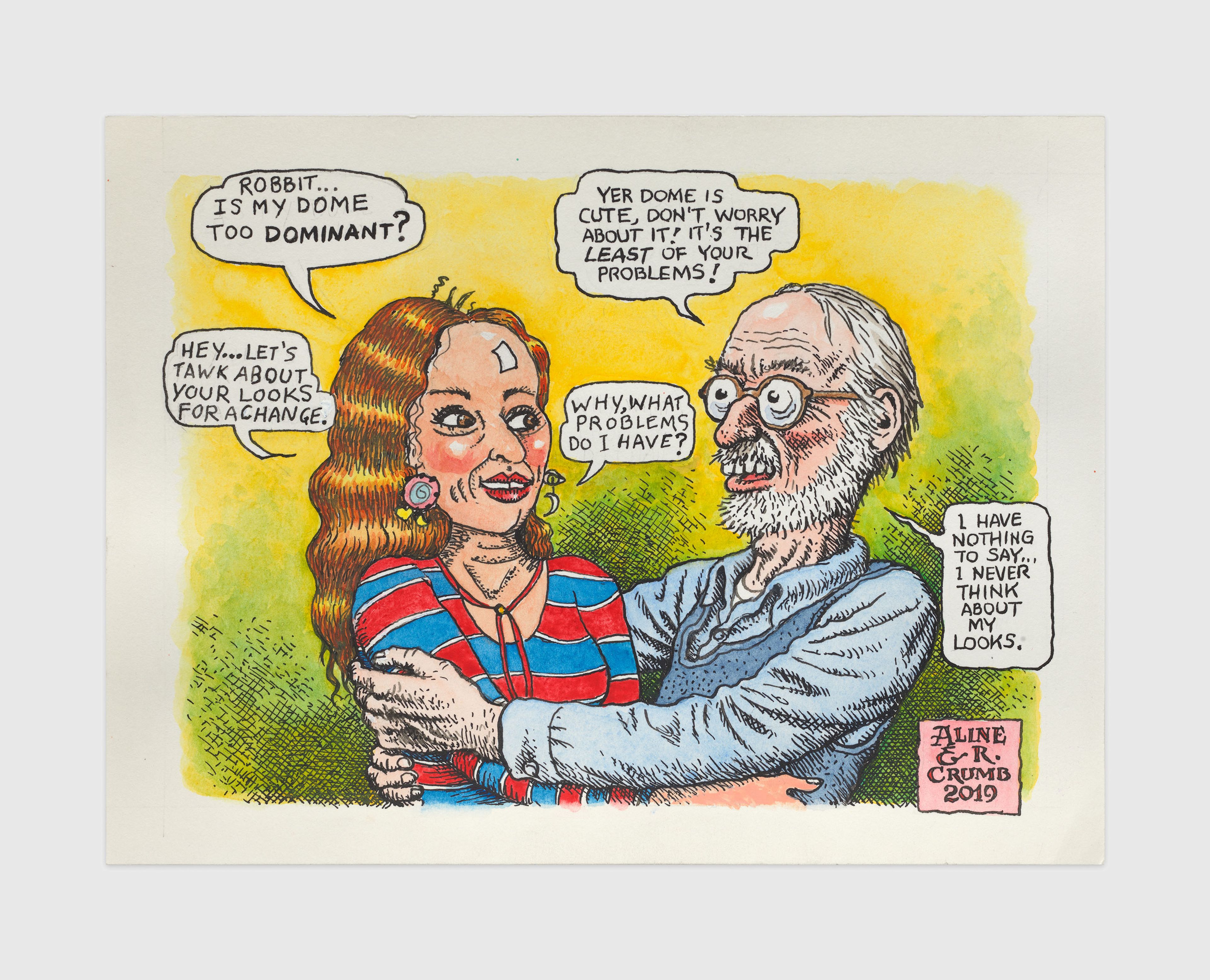 R. Crumb, Robbit...Is My Dome Too Dominant?, 2019, Gouache, ink, and graphite on paper, 7 x 9 1/2 inches